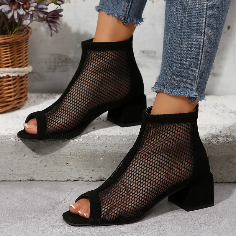 • Boot Zapatos Chaussures Femme Zipper Square High Heel Leopard Woman Shoes Mesh Suede Ankle Boots Size