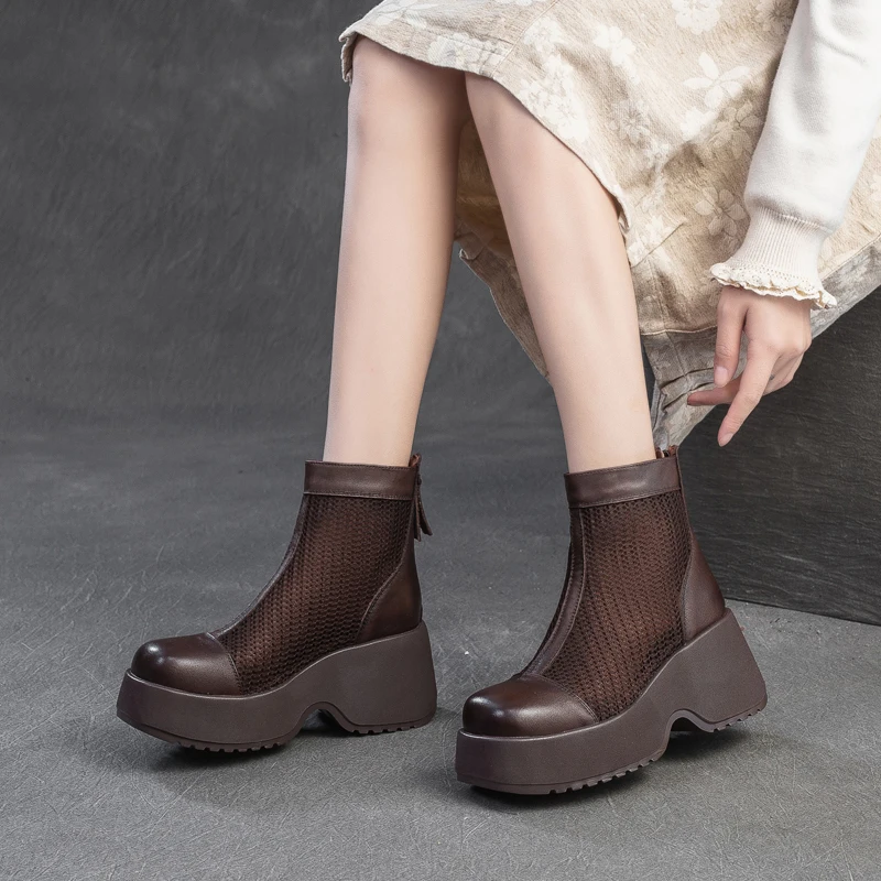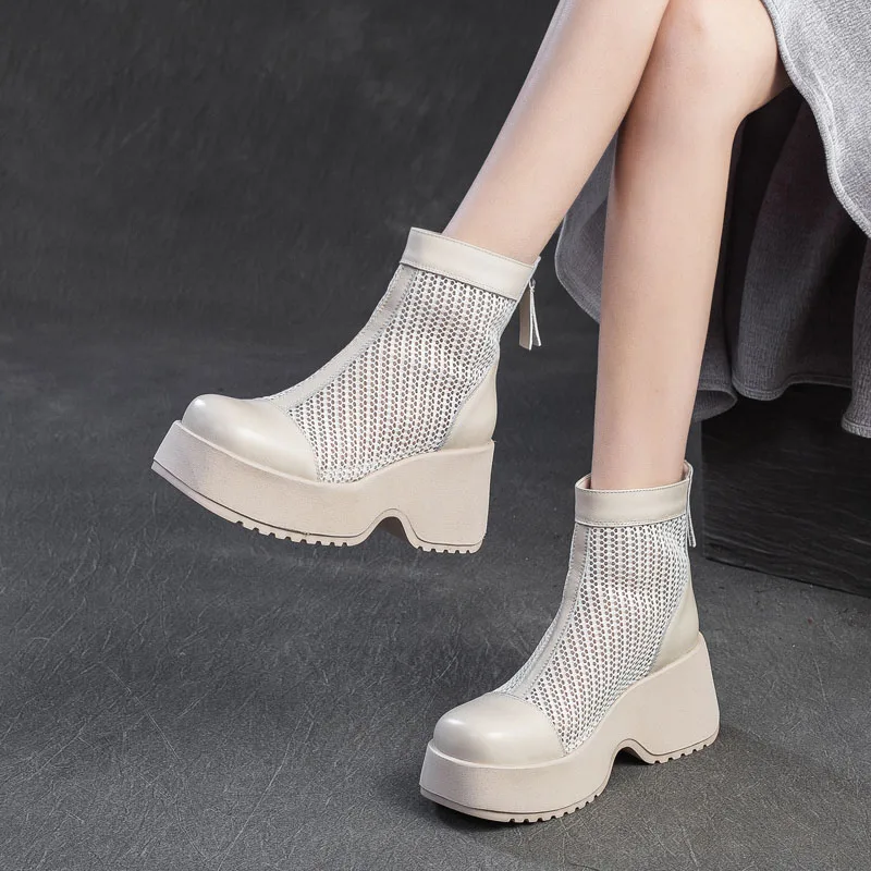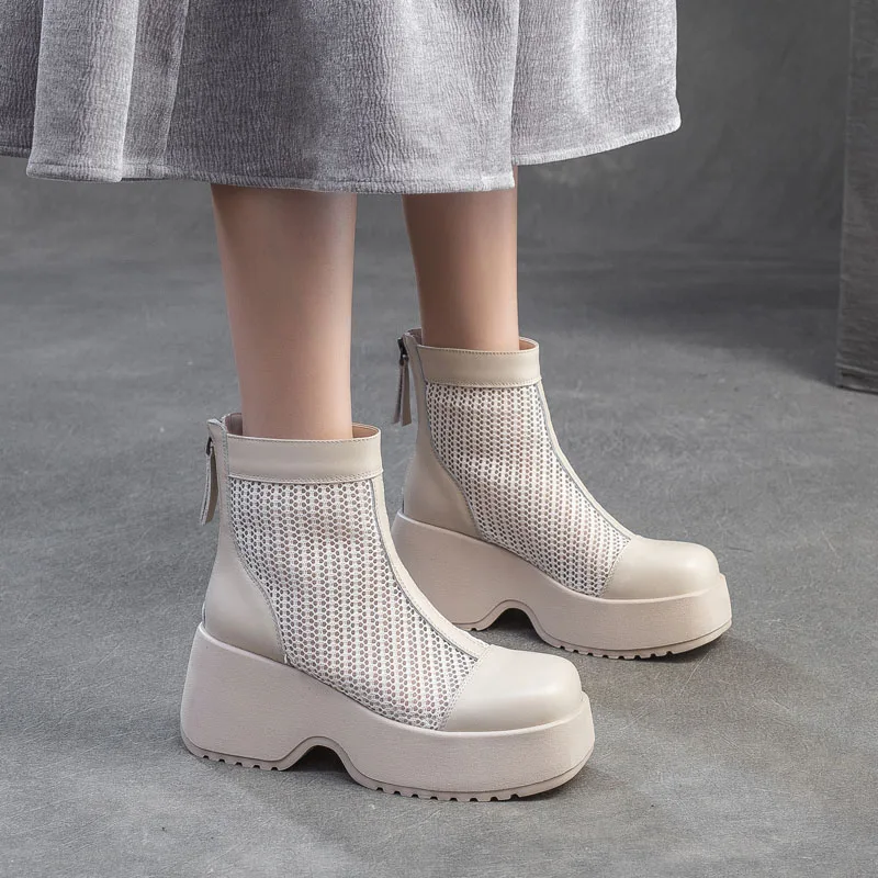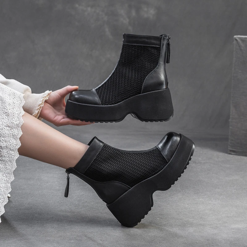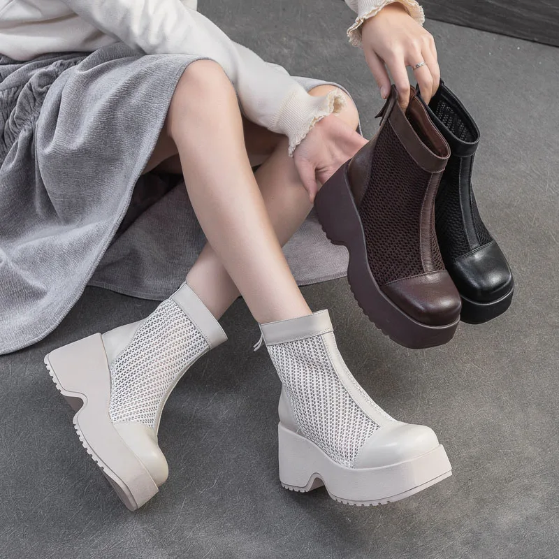 Literary Style Summer Cool Boots Women Genuine Leather Air Mesh Breathable Ankle Boots Lady Platform Wedges Roman Boots