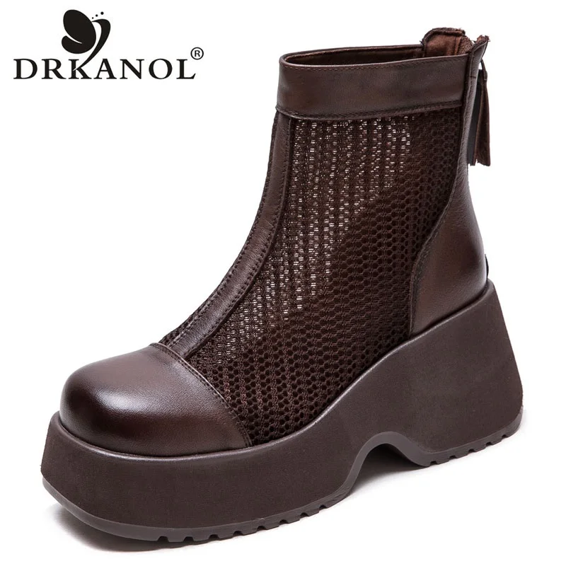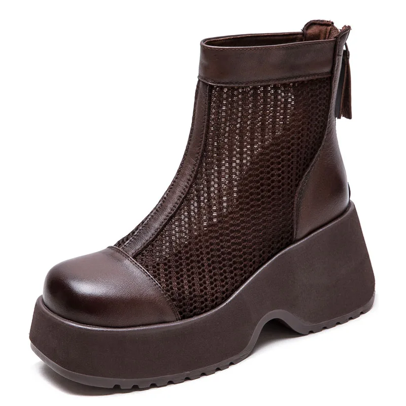 • Literary Style Summer Cool Boots Women Genuine Leather Air Mesh Breathable Ankle Boots Lady Platform Wedges Roman Boots