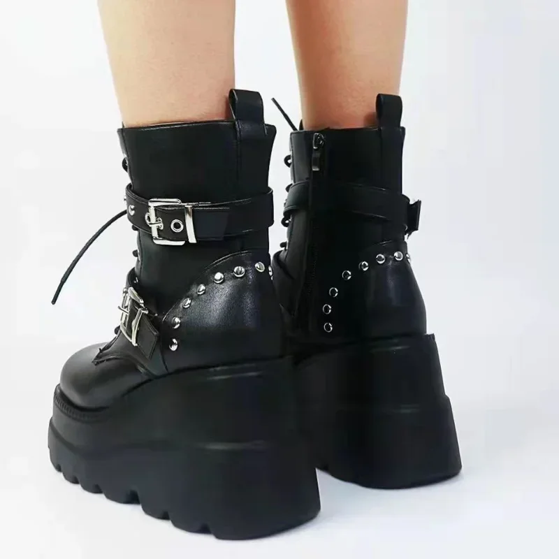 • Pu Leather Ankle Boots Women Autumn Winter Round Toe Lace Up Shoes Woman Motorcycle Platform Botas Gothic Shoes