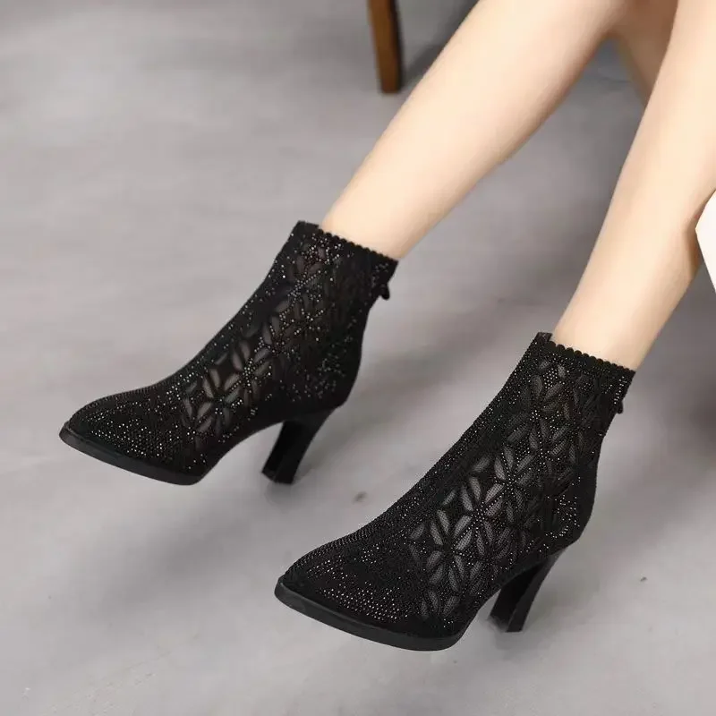 Women Hollow Mesh Ankle Boots Summer Fashion Rhinestone Square Heel Pointed Toe Zipper Sandals Casual High Heels Shoes