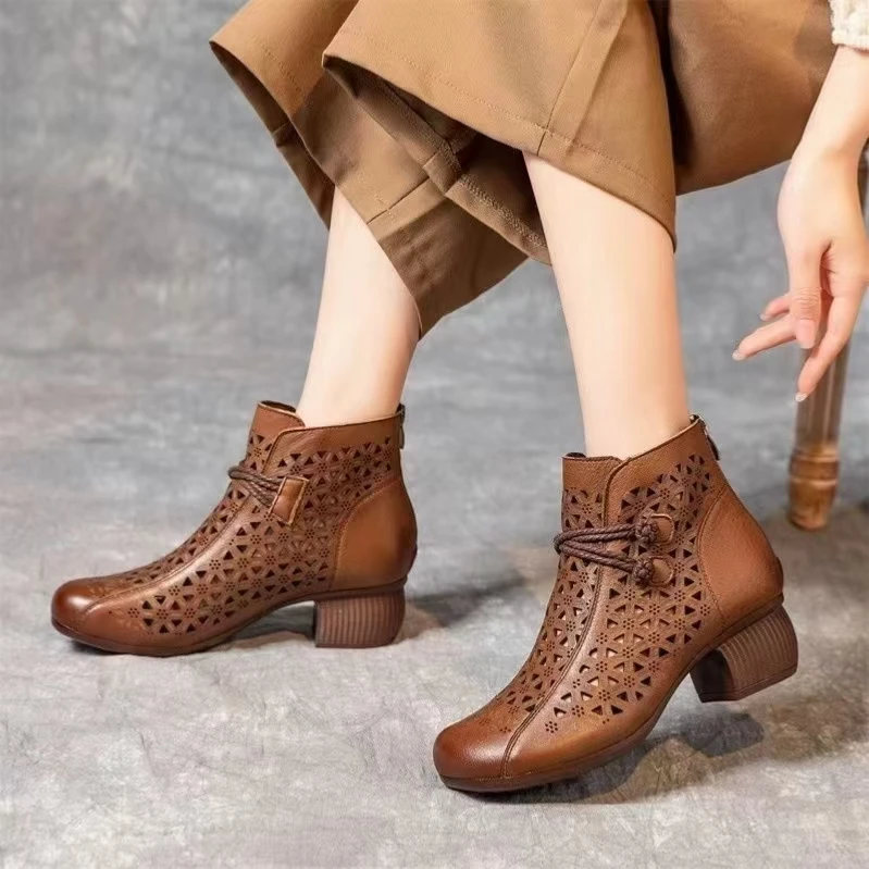 Leather Hollow Out Block Heel Ankle Boot Soft Sole Non Slip Breathable Round Toe Ethnic Style Cool Boots