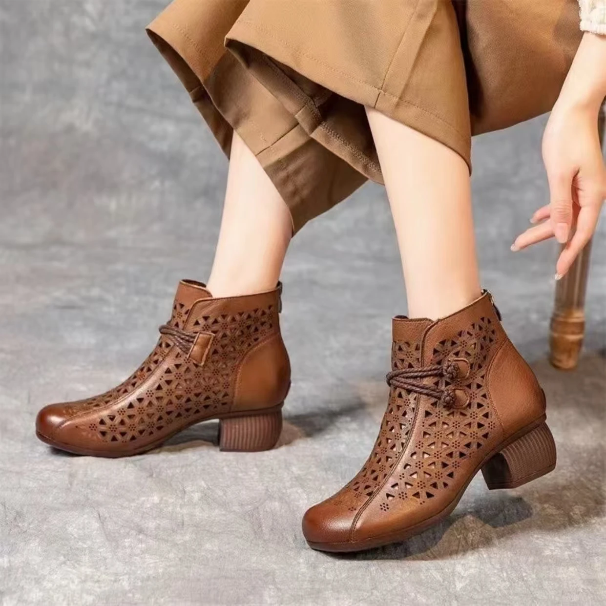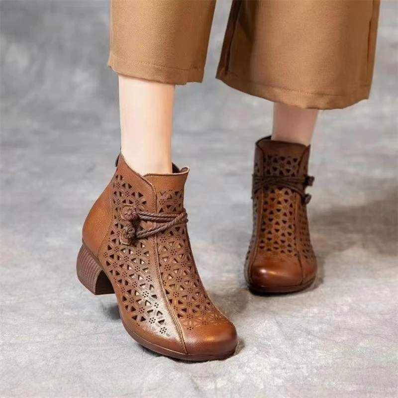 • Leather Hollow Out Block Heel Ankle Boot Soft Sole Non Slip Breathable Round Toe Ethnic Style Cool Boots